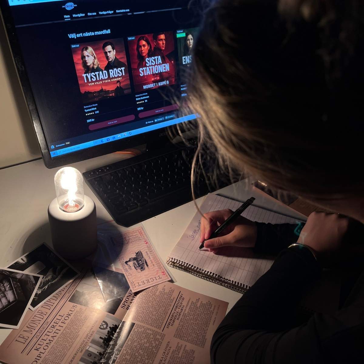 Alla våra spel skrivs av Moa, 19 år, som gör varje mordgåta från grunden här i Göteborg. Hon bygger dem med logik, detaljer och vändningar som faktiskt håller. Och även om det ibland är svårt, går det alltid att lösa – tillsammans.