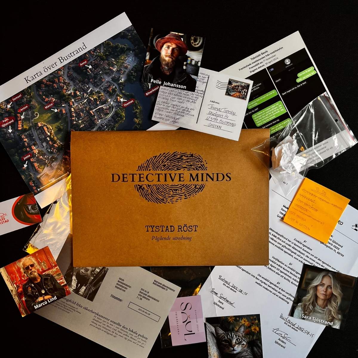 Ni öppnar kuvertet och sprider ut bevisen. Polisrapporter, bilder och kluriga ledtrådar – allt ligger där, bara att börja.
